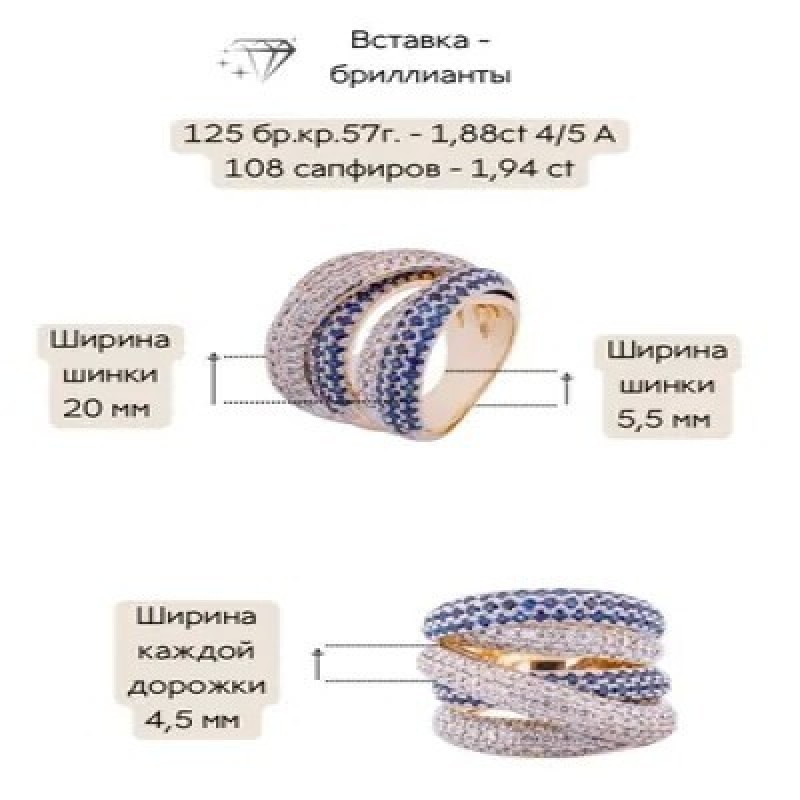 Женское кольцо из желтого золота 585 пробы с натуральными бриллиантами и сапфирами. Характеристика изделия: вес 13 г, 125 круглых натуральных бриллиантов - 1.88 ct 4/5А,  108 сапфиров - 1,94 ct. Значение веса и характеристик являются усредненными и могут незначительно отличаться от фактических. Наши ювелирные изделия проходят процедуру опробования и клеймения Российской государственной пробирной палатой. Пробирное клеймо нанесено с помощью лазерной гравировки. Каждому изделию присвоен УИН (уникальный идентификационный номер), который наносится на ярлык маркированных ювелирных изделий. По нему Вы можете получить достоверную информацию о ювелирном изделии на официальном сайте Российской государственной пробирной палаты. Бриллианты проходят независимую геммологическую экспертизу в лаборатории МГУ. Украшение приходит в комплекте с фирменной упаковкой: футляром для ювелирного изделия, фирменным пакетом и небольшим комплиментом. Мы работаем для Вас с 2007 года.