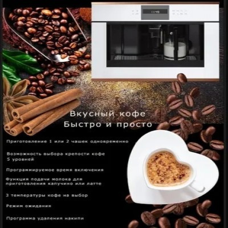 Кофемашина Kuppersbusch CKV 6550.0 ЖК-дисплей с текстовым и графическим полями Электронная система управления с сенсорными кнопками Программируемое количество кофе для 5 размеров чашек (эспрессо, малая, средняя, большая, высокая) Приготовление 1 или 2 чашек Функция подачи молока для приготовления капучино или латте Съемный контейнер для молока с функцией очистки Возможность использования кофейных зерен или молотого кофе Регулируемый по высоте раздатчик кофе Давление при заваривании ? 15 бар 3 температуры кофе на выбор Возможность выбора крепости кофе (5 предварительно заданных уровней) Отдельные нагреватели для заваривания кофе и приготовления горячей воды Программа удаления накипи Автоматическое ополаскивание при включении и отключении Емкость для воды заполняется спереди Электронный таймер с белыми индикаторами Программируемое время включения Режим ожидания Телескопические направляющие для легкого заполнения кофемашиныПодсветка чашекНаблюдение доставляет удовольствие - хорошо известный факт. Светодиодная подсветка преподносит только что сваренный кофе в правильном свете. И приготовление кофе становится хорошей традициейЕмкость для свежей водыДуховые шкафы и кофемашины Kuppersbusch легко встраиваются в любую кухонную мебель, так как благодаря наличию емкости для свежей воды подсоединение к водопроводу не требуютсяХарактеристики:Потребляемая мощность: 1,35 кВт (вилка Schuko)Размеры прибора (Ш x В x Г): 595 x 455 x 475 мм (вкл. фасад 20 мм и телескопические направляющие) Размеры ниши (Ш x В x Г): 560 x 450 x 550 мм
