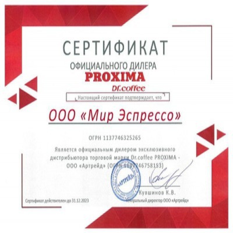 Профессиональная кофемашина Dr.coffee PROXIMA F20 (с подключением к водопроводу)   Профессиональная супер-автоматическая кофемашина Dr.coffee PROXIMA F20 (Доктор кофе Проксима Ф20) – специально разработана для кофеен и пекарен, баров и ресторанов, кафе и фастфудов формата «кофе с собой» (Coffee To Go), в зонах самообслуживания, кофе-брейка (Coffee Break) сотрудникам и посетителям среднего и крупного офиса. Гарантирует высокую производительность – до 300 порций любого из 24 кофейно-молочных напитков одной кнопкой! Широкий функционал и выдающиеся характеристики. Инновационная модульная конструкция, позволяющая свободно комбинировать высокопроизводительные функции, может применяться в различных сценариях. Простота установки и обслуживания. Русифицированное меню.■ 2 кофемолки с плоскими керамическими жерновами и профессиональная помпа обеспечат неизменно высокое качество напитков при максимальной нагрузке!■ 3 системы водоснабжения: внутренний погружаемый контейнер – 4.0 л, внешняя емкость – бутыль (канистра), подключение к водопроводу.■ 5-ступенчатая система предварительного заваривания молотого кофе увеличивает экстракцию и придает напитку более глубокий вкус кофе и усиливает аромат.■ Автоматическая промывка кофейной и молочной систем при включении/выключении кофемашины. Очистка кофемашины одним касанием: декальцинация, промывка центрального (заварочного) устройства, промывка молочной системы, промывка системы сухих ингредиентов. Кофемашина оснащена встроенным клапаном для промывки молочной системы. Промывка осуществляется без извлечения заборной трубки из емкости с молоком или холодильника.■ Возможность подключения телеметрии и платежной системы (удаленный мониторинг работы кофемашины, систем оплаты и выдачи напитков). Импорт/экспорт настроек напитков и настроек кофемашины через USB. Поддержка MDB-протокола.■ Возможность подключения холодильника для молока с функцией автоматической промывки молочной системы без извлечения силиконовой полупрозрачной трубки из емкости с молоком или холодильника.■ Встроенный датчик наличия молока в системе и датчик температуры молока. При отсутствии молока приготовление напитков с его содержанием блокируется.■ Встроенный профессиональный регулируемый автоматический капучинатор. Инновационная система вспенивания молока и усовершенствованный капучинатор позволяют готовить качественную высокую и плотную молочную пену. Широкий диапазон настроек структуры пены. Настройка приготовления молочной пены в меню кофемашины.■ Демонстрация рекламных (информационных) заставок на 10.1-дюймовом сенсорном LED-дисплее в процессе приготовления напитков и в режиме ожидания.■ Интервал проведения технического обслуживания: каждые 6 месяцев или каждые 10 000 порций.■ Интерфейс позволяет изменять количество иконок на дисплее, места расположения иконок приготовления напитков и отключать неиспользуемые напитки, изменять наименования напитков и добавлять новые. Широкий диапазон настроек напитков. Блокировка функции изменения параметров напитков для пользовательского меню. Кастомизация заставок в режиме ожидания.■ Контейнеры: воды – 4.0 л, зернового кофе – 2 х 0.7 кг каплесборник – 0.7 л, кофейных отходов – 70 порций (1 порция – 10 гр).■ Корпус кофемашины выполнен из пластика.■ Кофемолка с плоскими керамическими же